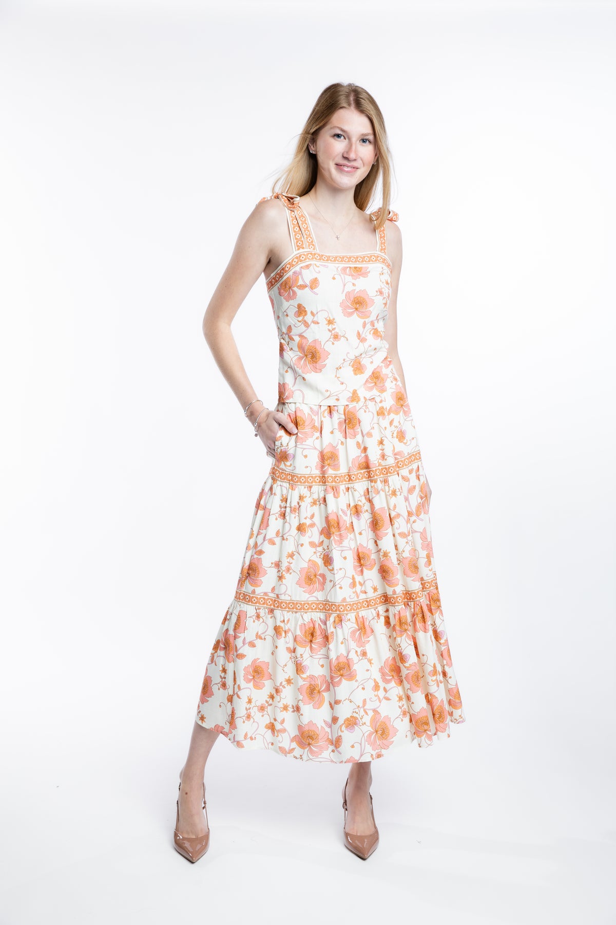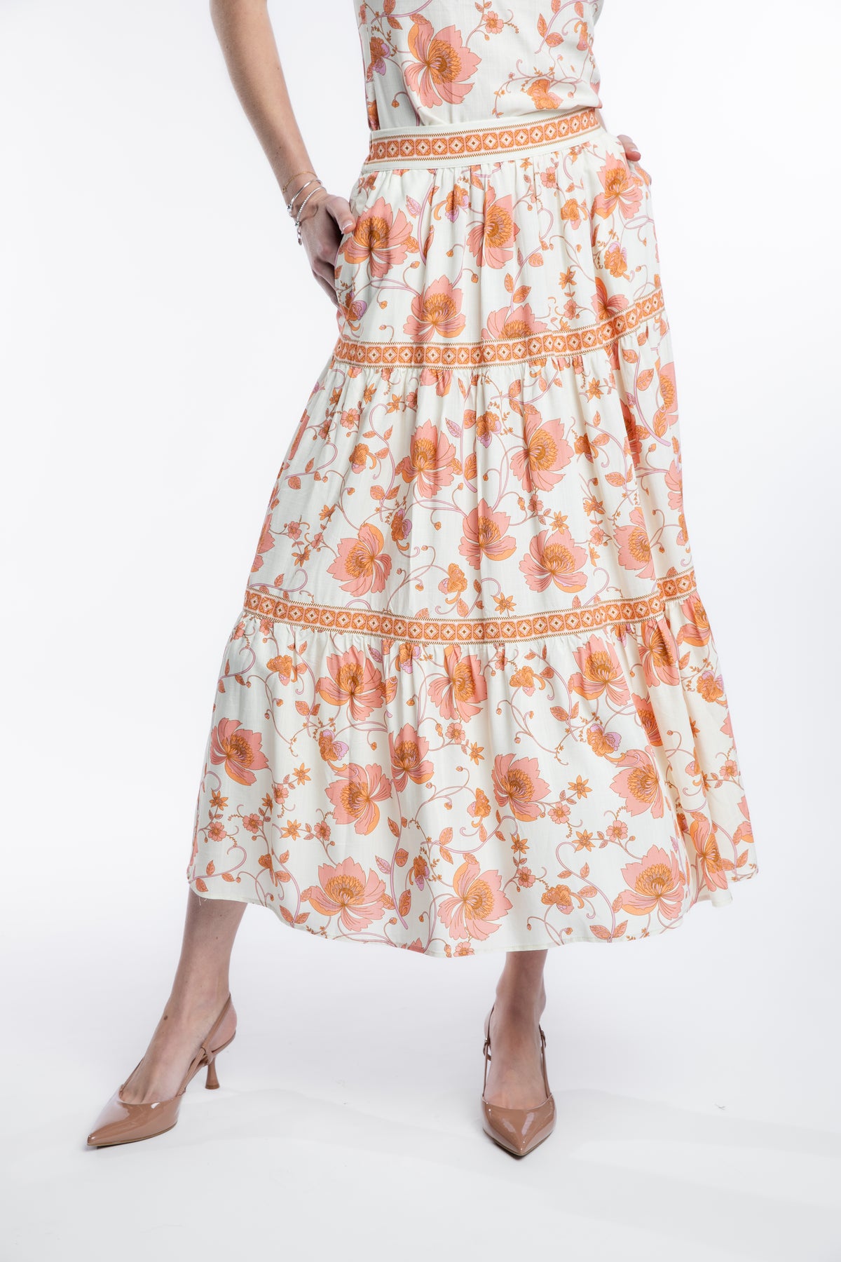 The Claire Skirt is crafted in the same rose print, flowing with a feminine shape. Light and graceful, it moves beautifully and feels effortlessly romantic, a perfect match for the Andi tank or the Kitty blouse for a more refined look.