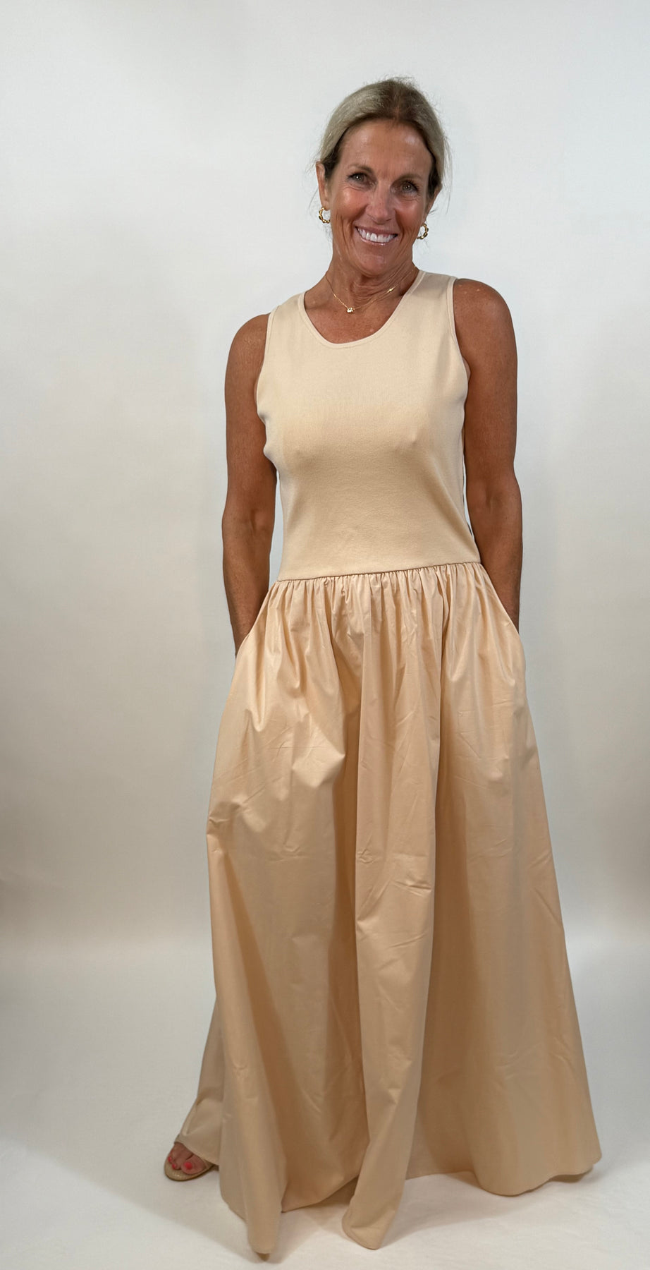 Introducing The Gwen: a one of a kind look featuring a unique mix of textures and materials. The  top is a soft cotton stretch rib and the bottom is a crisp cotton with pockets! Perfect for spring days and warm evenings, this sleeveless dress is the “ IT “ Dress of spring 2025!