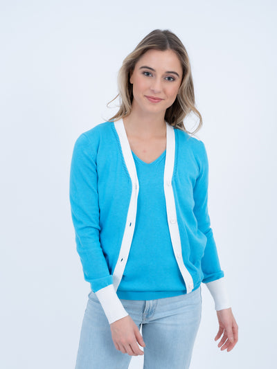 The Detailed Cardigan is a symphony of delicate details and classic design. This V-neck cardigan captivates with its elegant four-button closure and the charming contrast of trim color on the placket and wrists. The mini cable detail that traces the neckline adds a touch of traditional craftsmanship, creating a piece that's both timeless and contemporary. Falling below the waist, this cardigan offers a silhouette that is flattering for all, marrying ease with sophistication. The detailed cardigan is a versatile piece that seamlessly transitions from office elegance to weekend leisure, a true celebration of refined style.