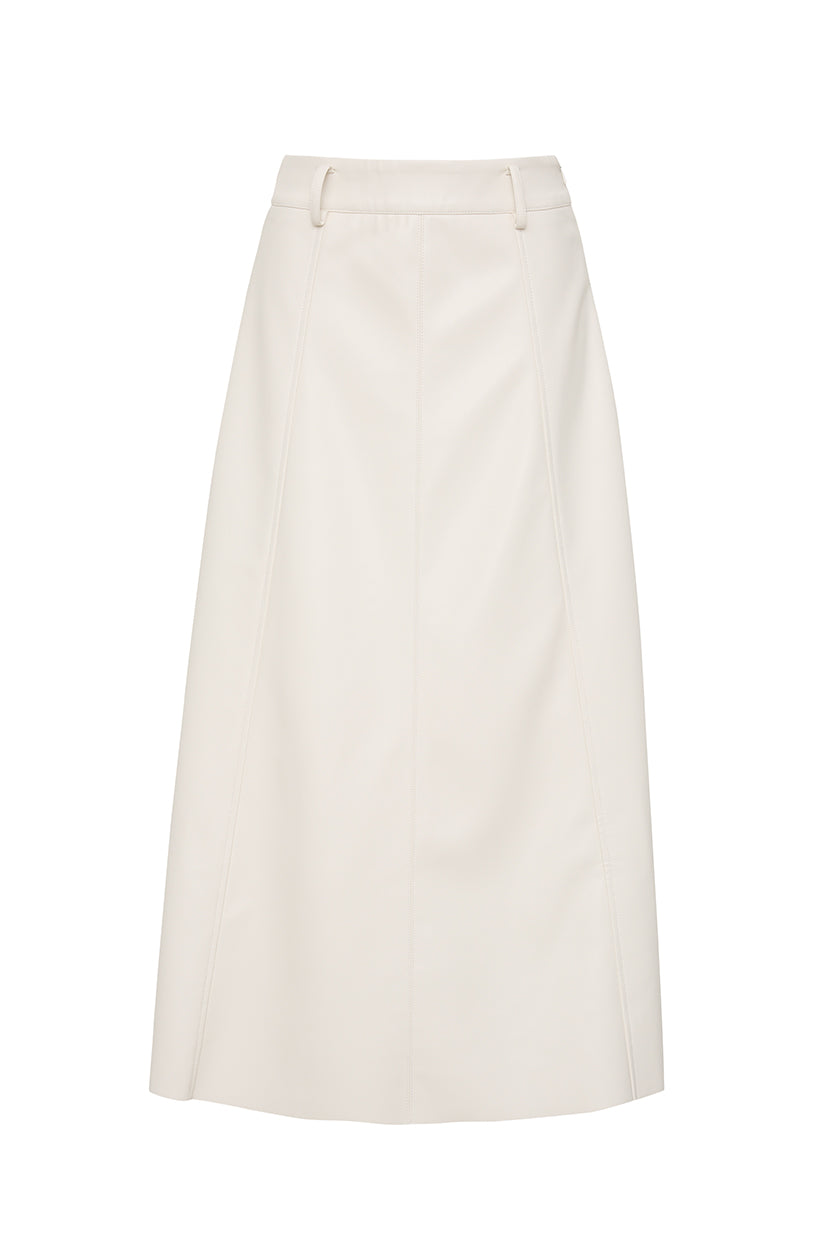A clean A-line cut, reimagined in supple faux leather. The Eve skirt sits smoothly with a side zip and includes belt loops for styling versatility. Modern and striking, it’s designed to hold its shape while softening with wear.